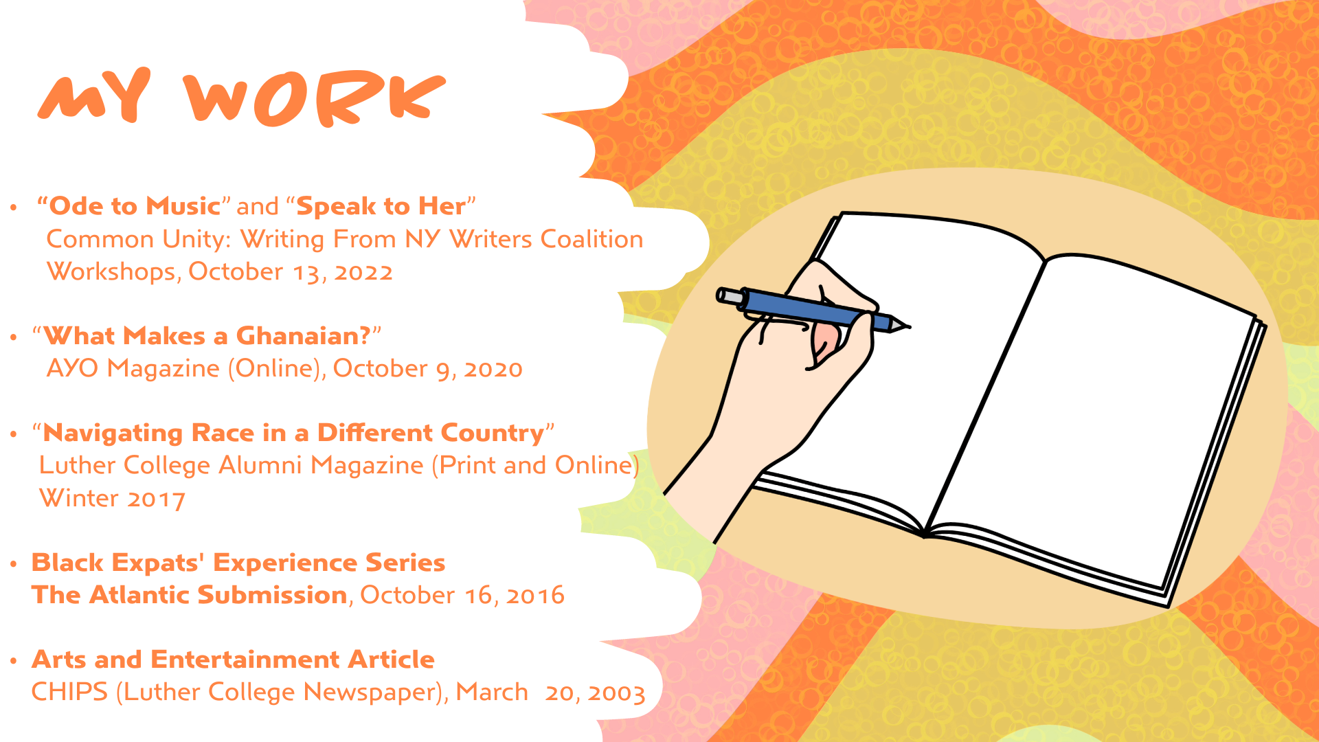 I am a lover of the arts, and sports. Writing has always been an integral part of me and is the reason I majored in English. It is my gift and as a creative who takes joy in putting pen to paper, I embrace compiling compelling narratives from the world around us. I pride myself on my impeccable work ethic which has demonstrated my dedication and commitment to the people I served throughout each stage of my professional career. Each of these experiences has increased my ability to compromise, respect others and be a good listener.